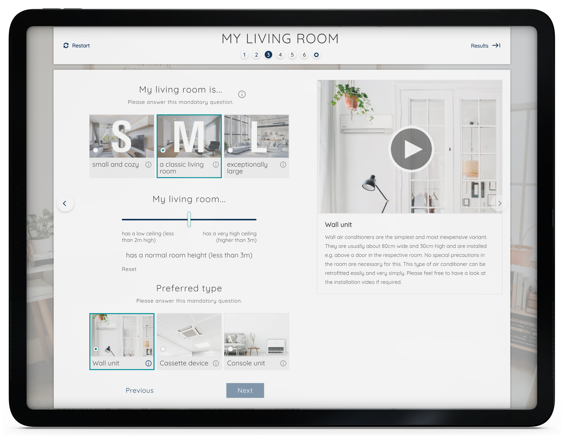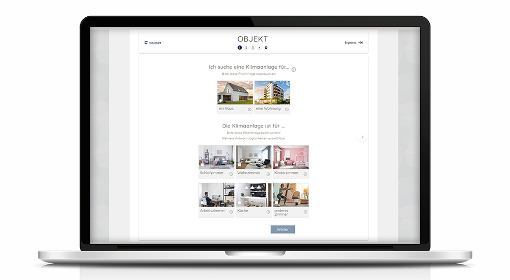 The KOS Klima Configurator provides website visitors with a wide array of air conditioning options for their housing needs. The configurator offers different advisory paths as a user can opt for general advice but can also choose specific or budgeted designs. To ensure that the best recommendations are given, certain mandatory questions are set to get answers to essential questions.