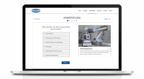 The Schmalz Product Advisor uncomplicates the advisory process for website visitors, especially when they work with particular types of materials and technical specifications. Explanation content is used to understand precise details and to highlight robot compatibility. It has also been translated into multiple languages.