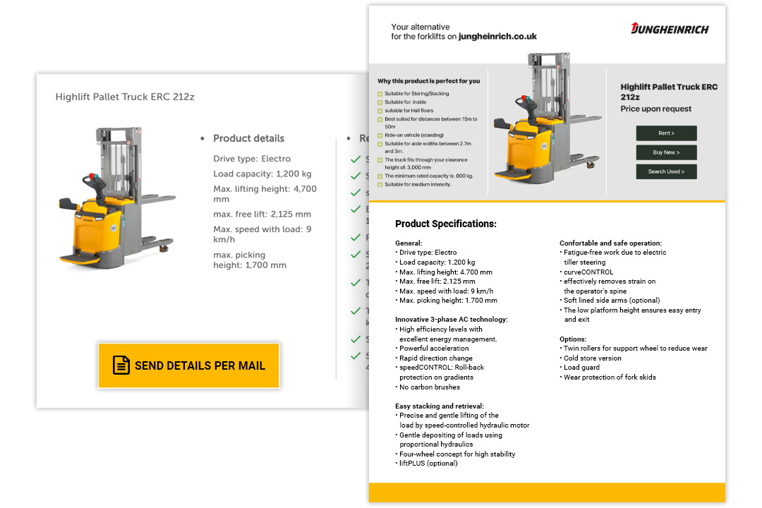 The Product Guide gives an option for customers to connect with Jungheinrich at each stage of the advisory process. It contains features such as PDF generation, product comparisons, and lead generation functionalities. It also offers video explanation content and smart preselections, making it easier for customers to select specific product features.