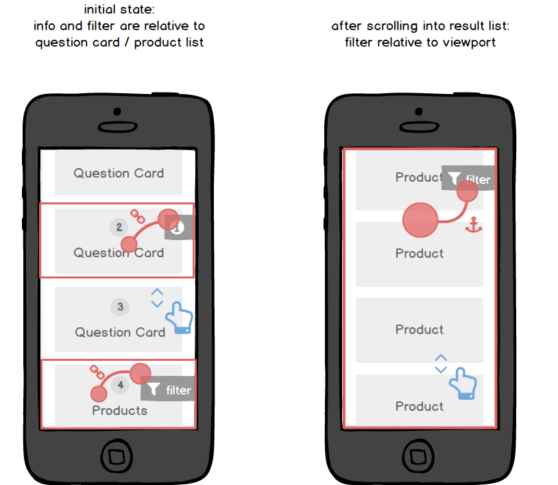 - Stickiness of action buttons, triggers or content elements in relation to another element e.g. a filter relative to the result list or a "help me choose" relative to a question card.