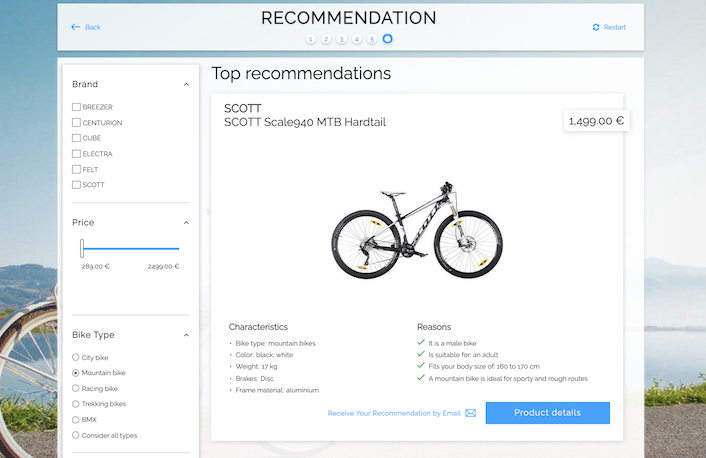 Our Guided Selling software offers many features to manage and retain initial customer queries. With our lead generation functionality you can send bike recommendations to your customers, making sure you stay top of the mind.