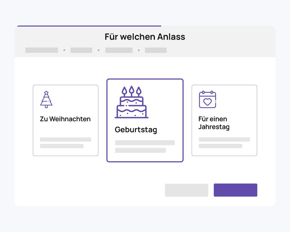 Der Geschenkefinder erfragt, für wen und zu welchem Anlass das Geschenk gedacht ist, um eine perfekte Empfehlung zu generieren.