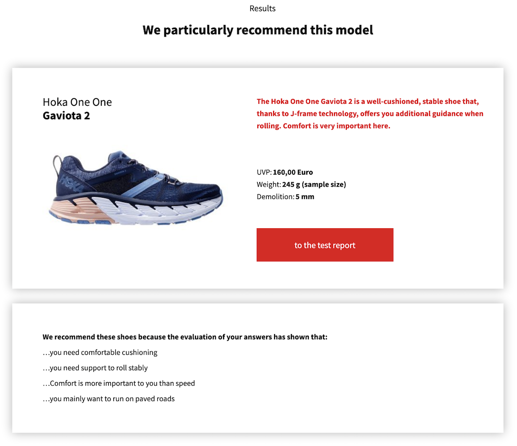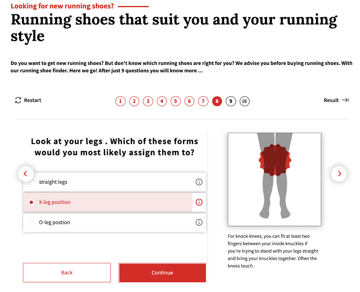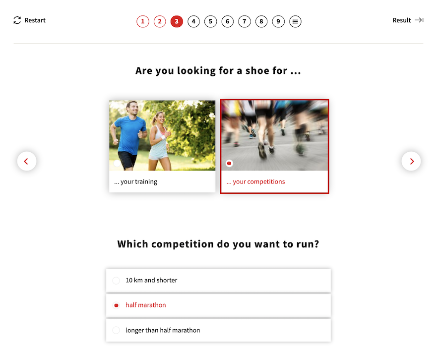 This Product Advisor truly helps a customer by assessing habits and events, e.g. injuries, pronations, etc. It also wants to understand their running goals to recognize the level of personal achievement an individual is aiming for. This ensures that the right use-case is met in every category of need. E.g. It would recommend a particular shoe for someone who wants to go trail running 4 times a week, with a tendency to over-pronate their right foot and has a certain budget in mind.