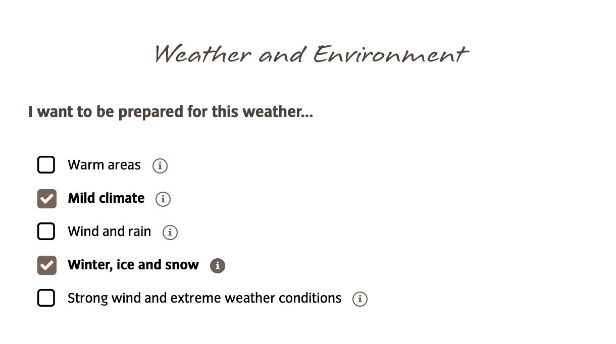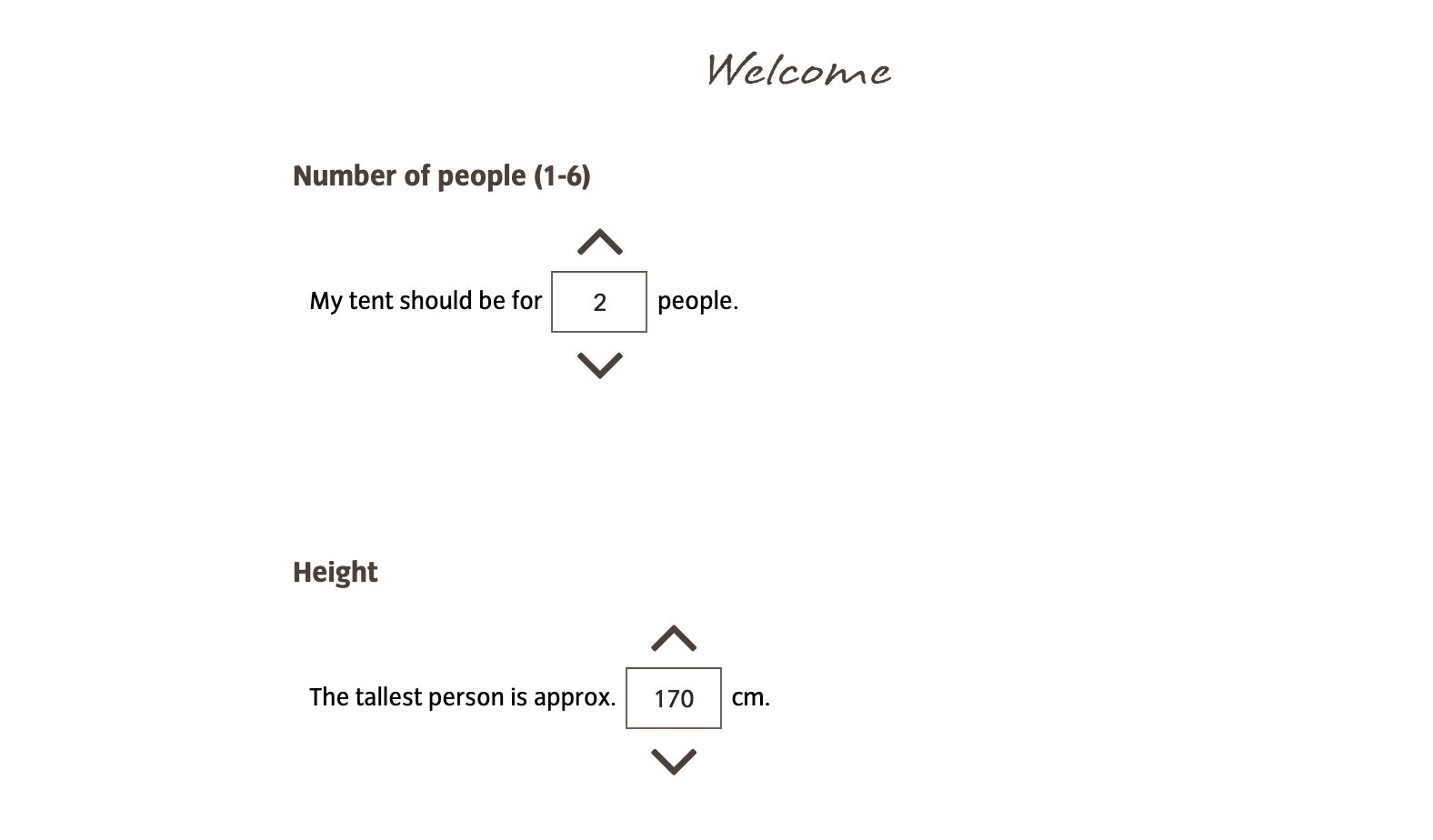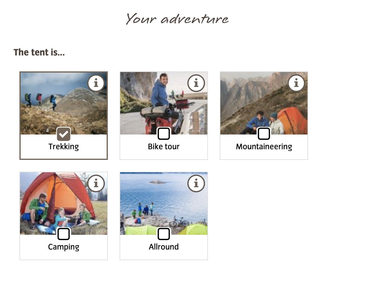 Camping trips themselves differ based on climate, season and region, but there are also other factors a customer must take into account. With the online Tent Advisor solution, you are able to recommend tents according for very specific needs. E.g. the kind of material used or the number of people going for the trip, etc.