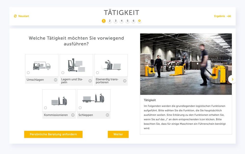 Jungheinrichs Gabelstapler-Berater führt in wenigen Klicks zur passenden Empfehlung.