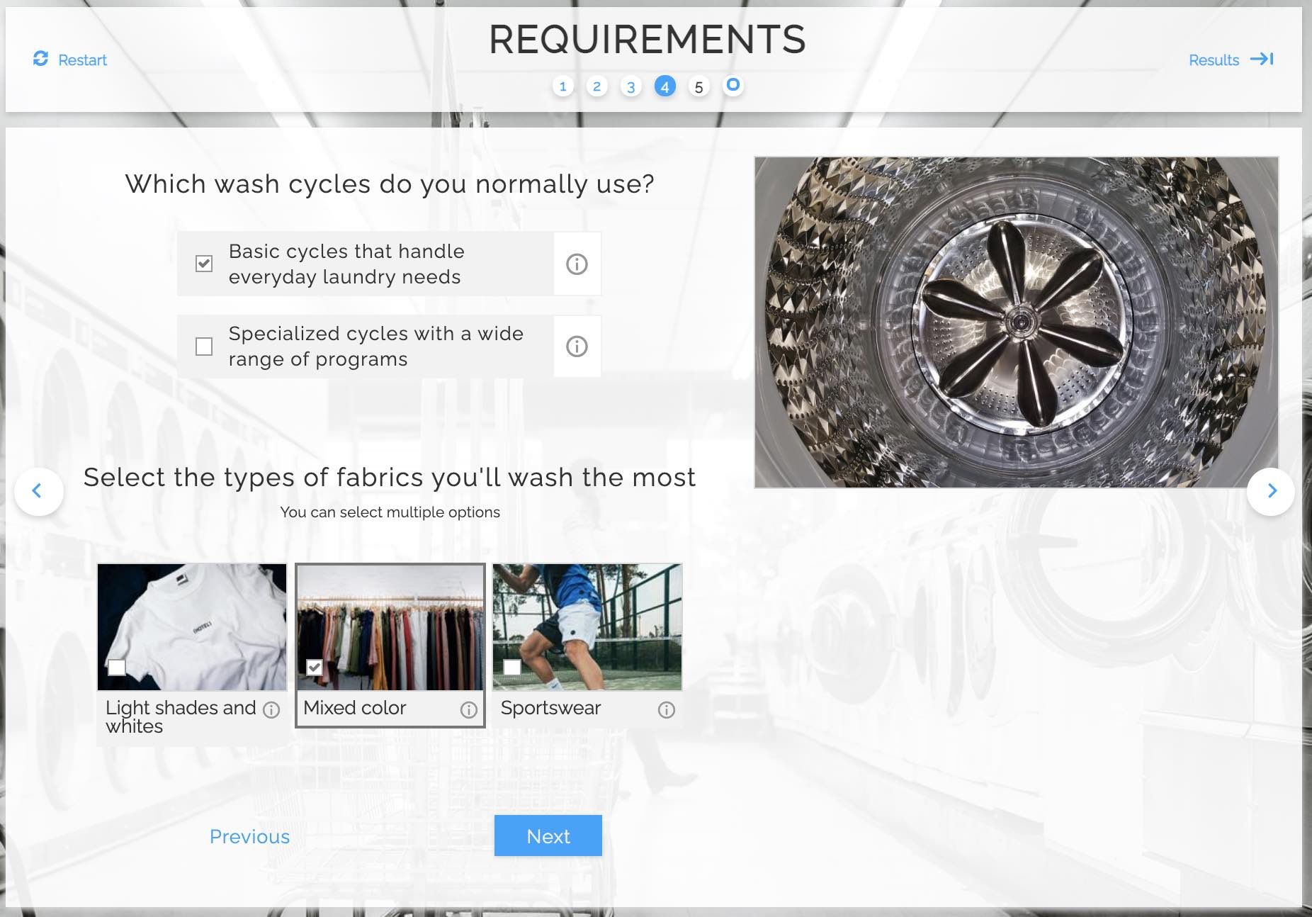Customers spend a lot of time researching features and trying to get the best deals for white goods such as washing machines. These products are brought once every 5 - 10 years, and is always a big decision for the customer. A digital advisor such as a Washing Machine Guide provides a step-by-step process for customers, allowing them to plan for every need and makes decision-making easier.
