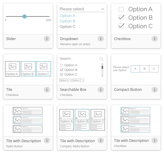 Mit der Widget Konfiguration können Sie eine Reihe von Darstellungsformen für die Fragen in Ihrem Produktberater wählen. Beispielsweise können Sie Slider, Radio Buttons, Dropdown-Menüs, Eingabefelder, Checkboxen und viele weitere einsetzen.