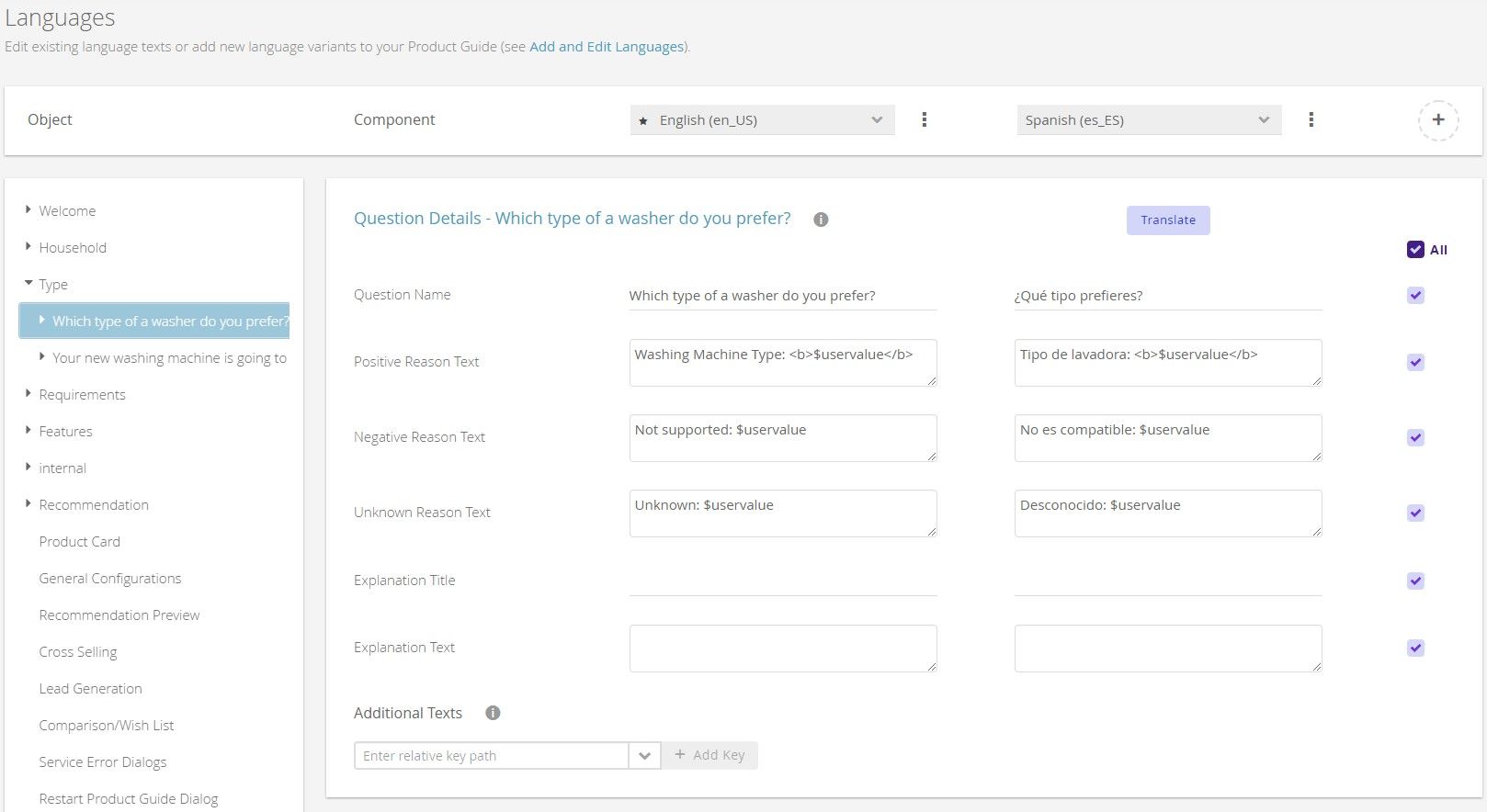Translate your Product Guide into different languages and adapt your product assortment and question flow to any international market.