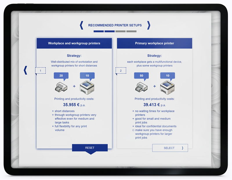 TCO calculation doesn't stop with the tradeoff between one-time and recurring costs. Our Guided Selling tools offer advice between different setups and installations strategies. Take printers, for example - you can use one large printer for the entire department, or many smaller printers spread across the office. With digital advice, you can provide your customers with all options available and show them which saves them the most over time.