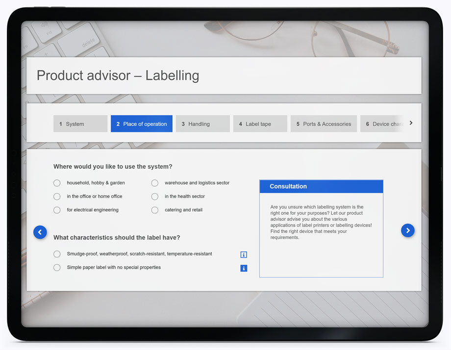 If we consider the example of labeling machines, we find a vast variety of use cases - and a typical user has not even thought about them all. The powerful Guided Selling solution focuses on every detail because missing only one detail, such as that the machine needs to print labels for plugs and cables, could render the bought product useless for the customer.