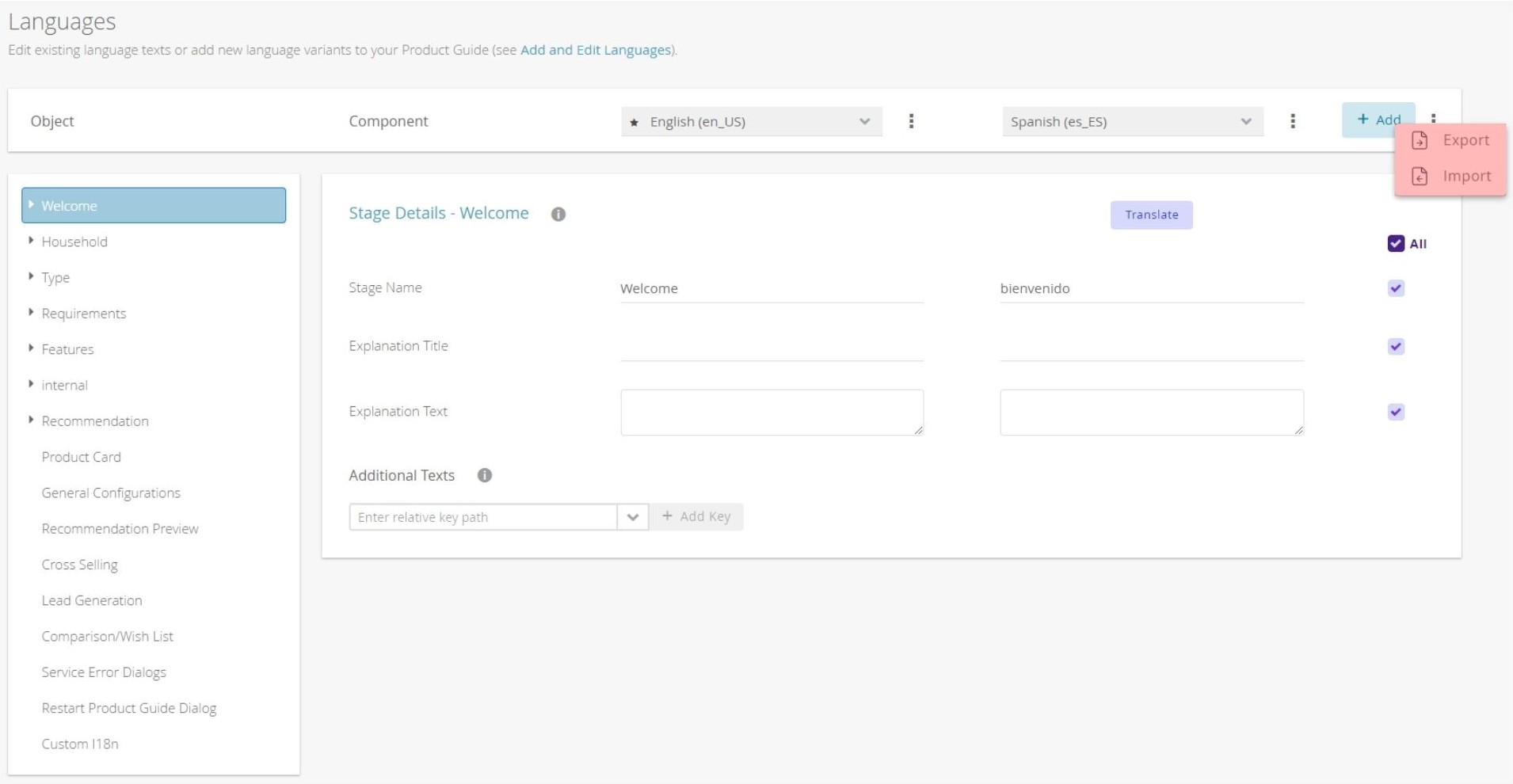 Once your stage or question is selected, add the language that you’d like to configure for your Product Guide.