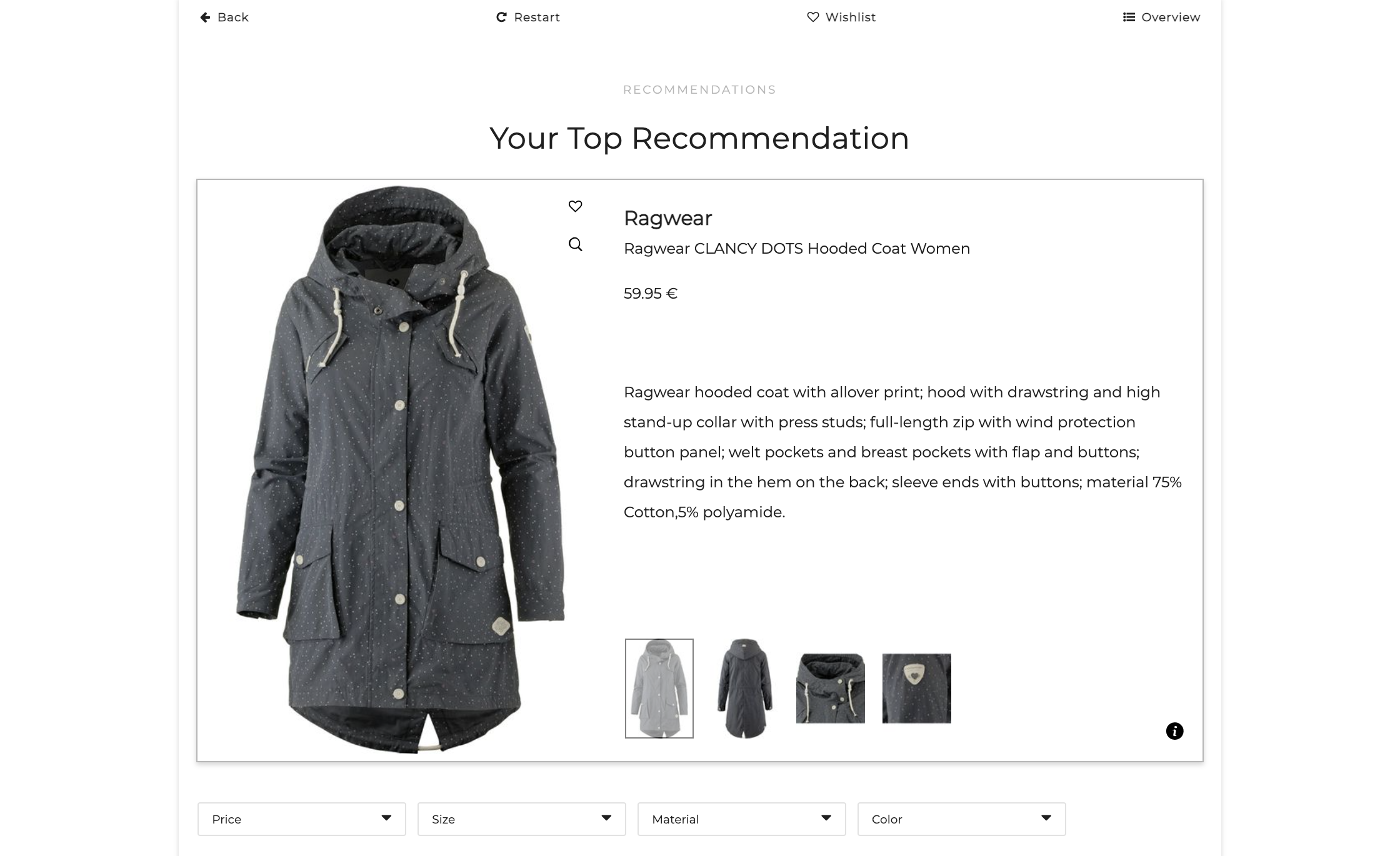 Your customers can hence mix and match their needs to get a coat recommendation that fits multiple criteria. E.g. A coat that’s stylish, but is equally durable and within a set budget.